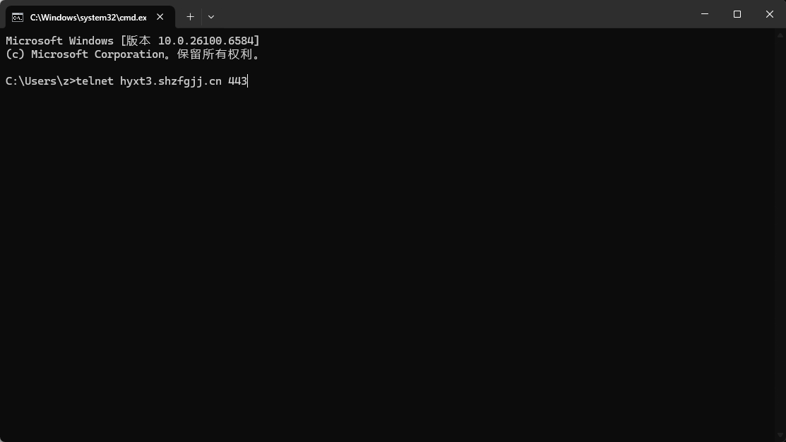 1)依旧在cmd界面,使用客户端的输入:telnet空格hyxt3.shzfgjj.cn空格443回车