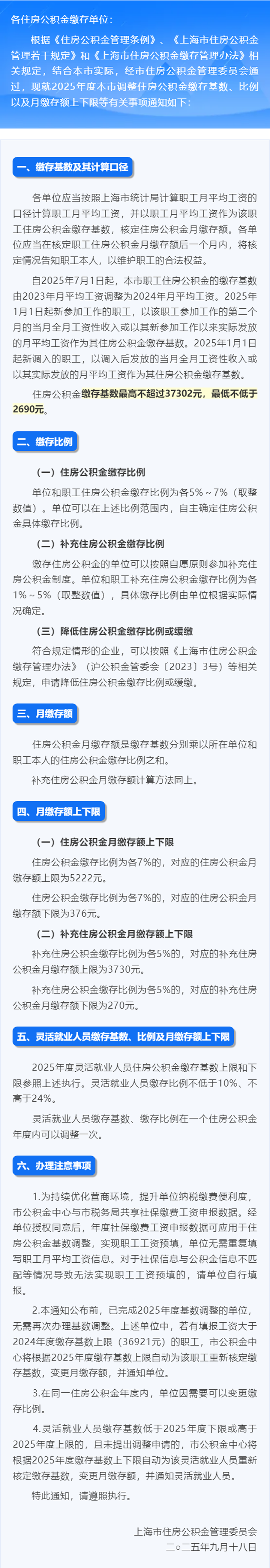 关于2025年度上海市调整住房公积金缴存基数、比例以及月缴存额上下限的通知